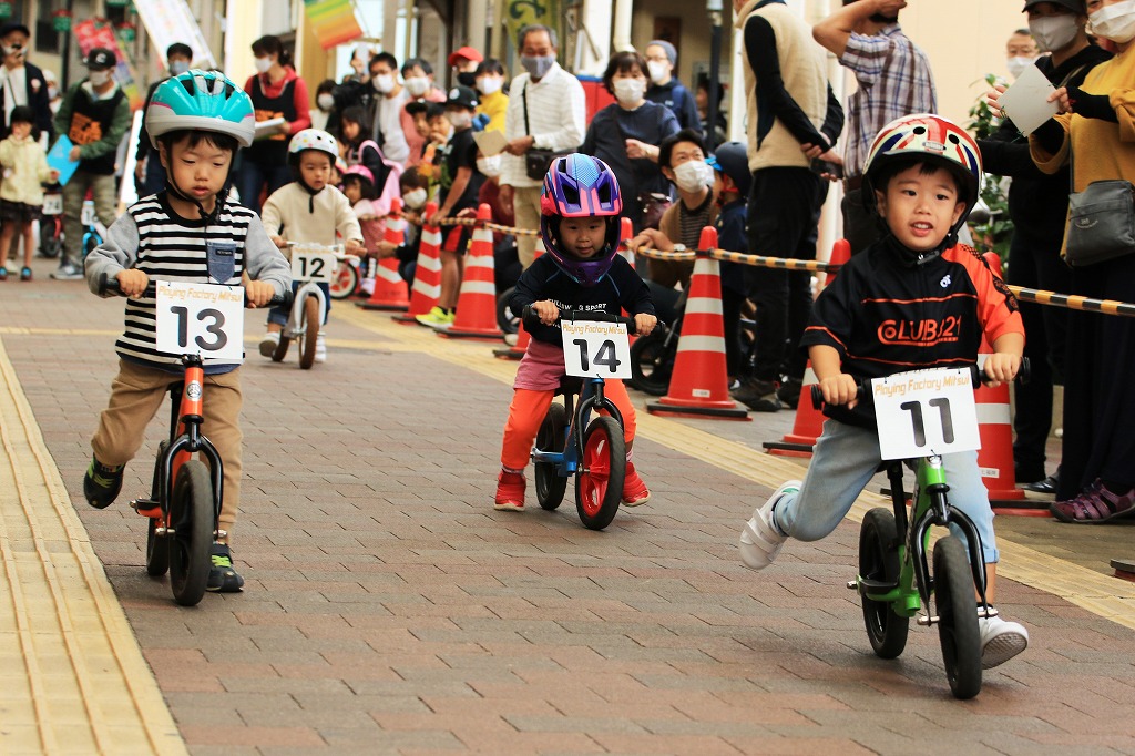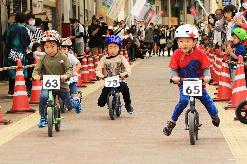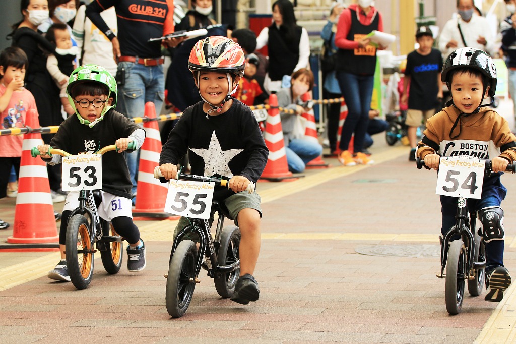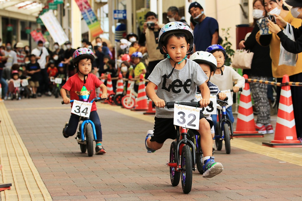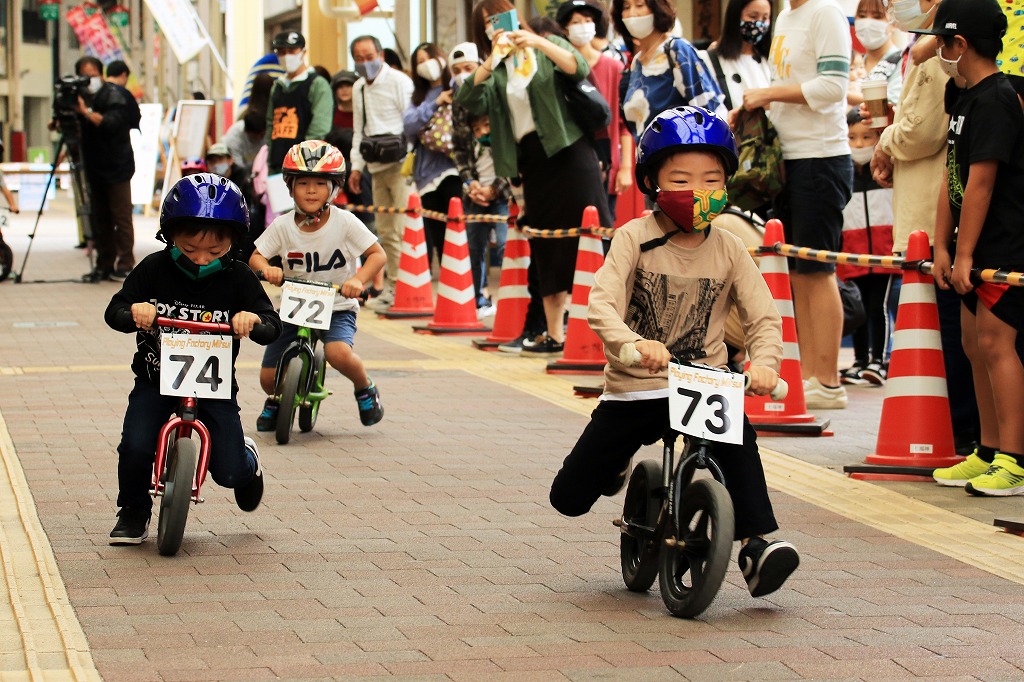 幼児向けランニングバイク(ペダルなし二輪遊具)を使った競走イベント「第3回山下こだいっちゃんカップ」が10月18日、延岡市の山下新天街で開かれました。コロナ禍で子ども向けイベントが少ない影響か、昨年を大きく上回る幼児56人が参加し、熱戦を繰り広げました。