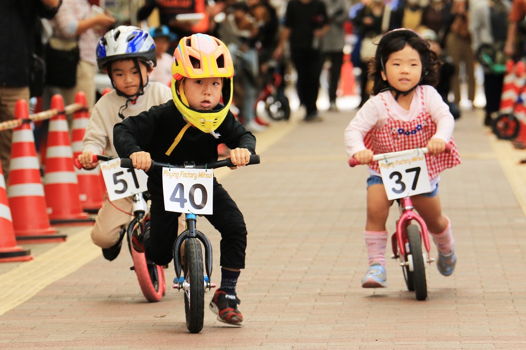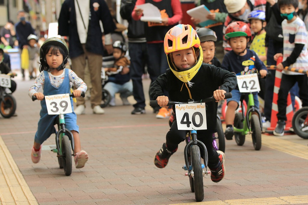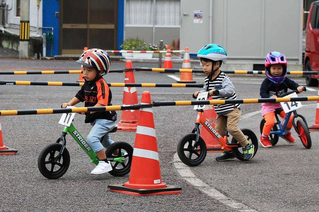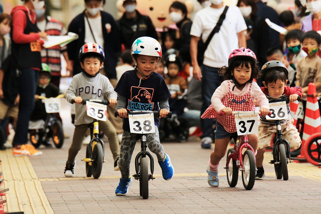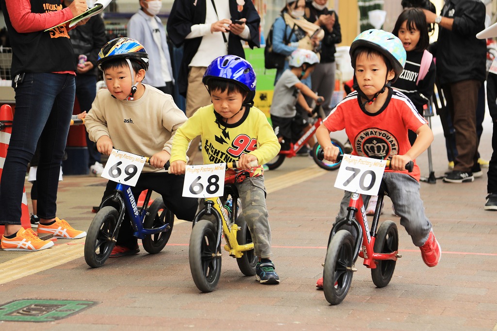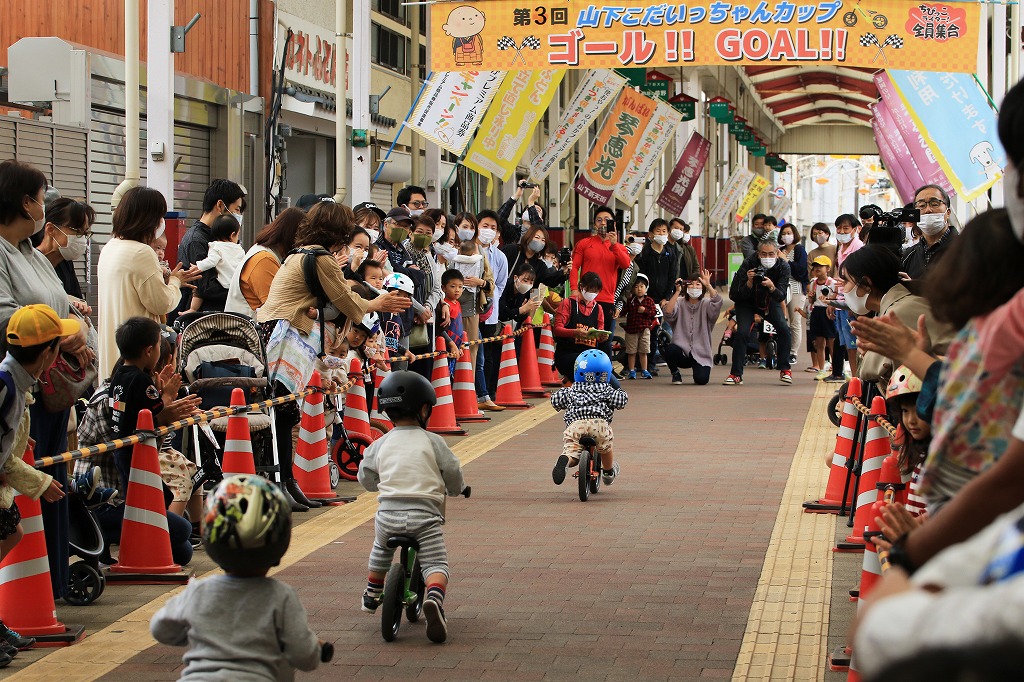 幼児向けランニングバイク(ペダルなし二輪遊具)を使った競走イベント「第3回山下こだいっちゃんカップ」が10月18日、延岡市の山下新天街で開かれました。コロナ禍で子ども向けイベントが少ない影響か、昨年を大きく上回る幼児56人が参加し、熱戦を繰り広げました。