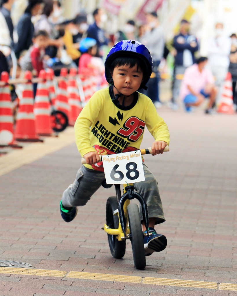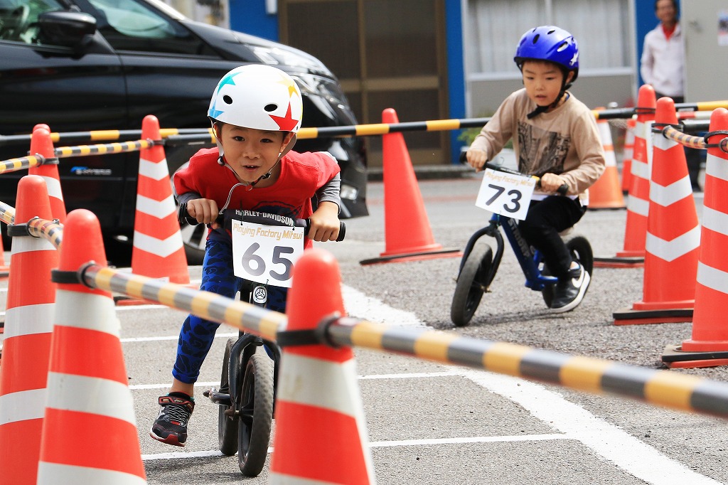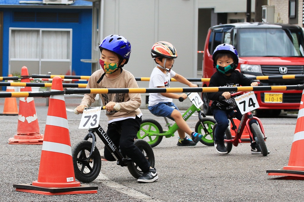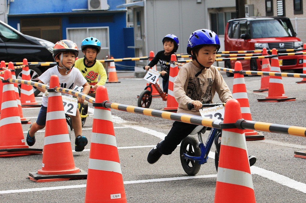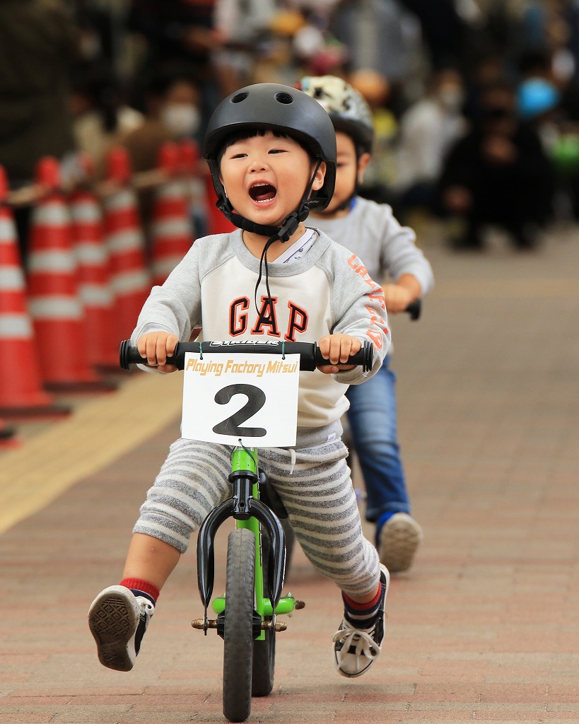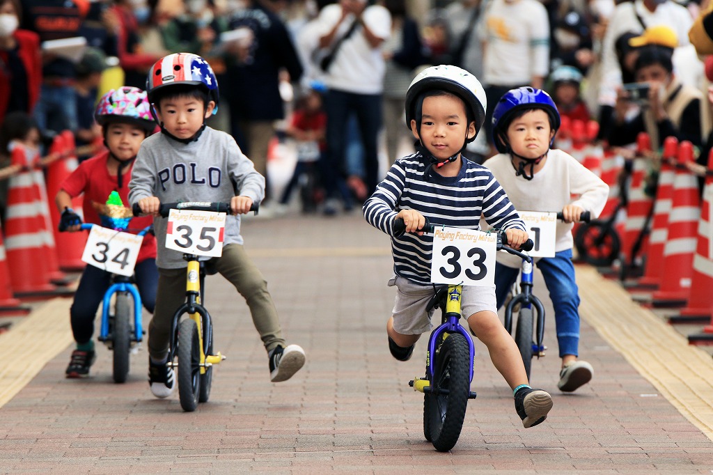 レース直前にエンジントラブル(泣き出し)で出走を断念した子どもや、母親の励ましを受けながら最後まで走りきる子どもの姿もあり、応援の人垣が笑顔にあふれました。途中で転倒しながらも走りきった子どもには、「ガンバレー」の声援と惜しみない拍手が贈られました。