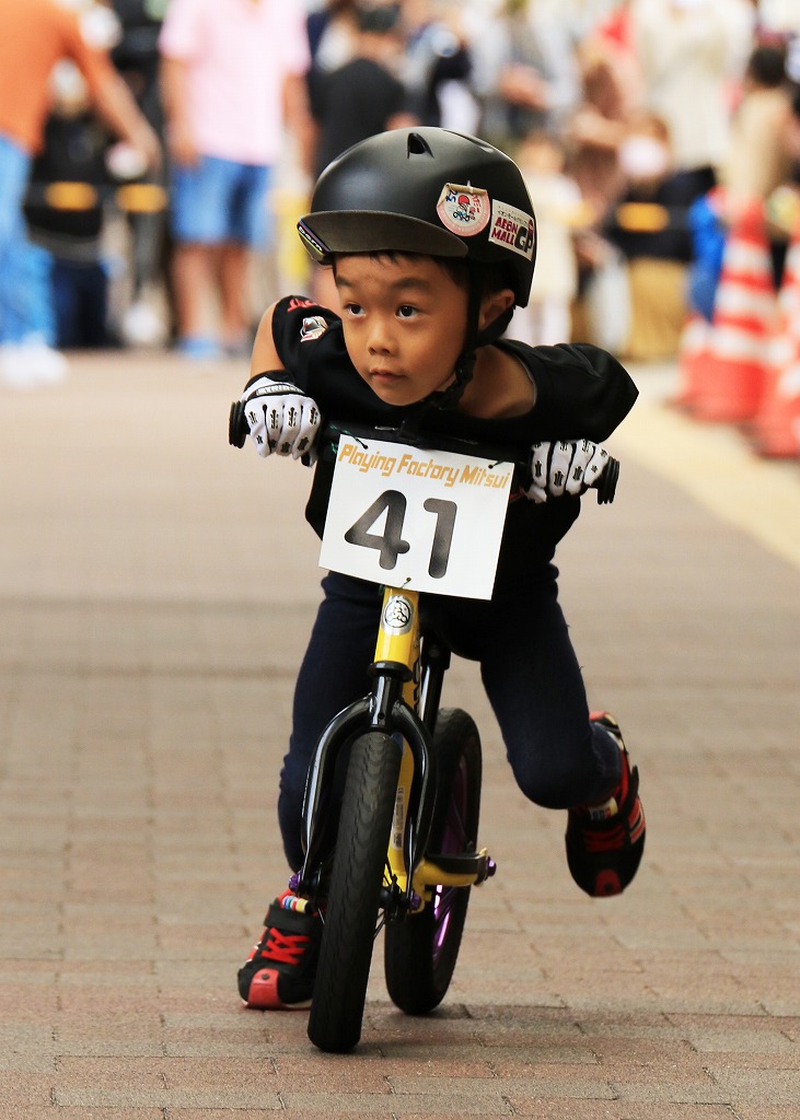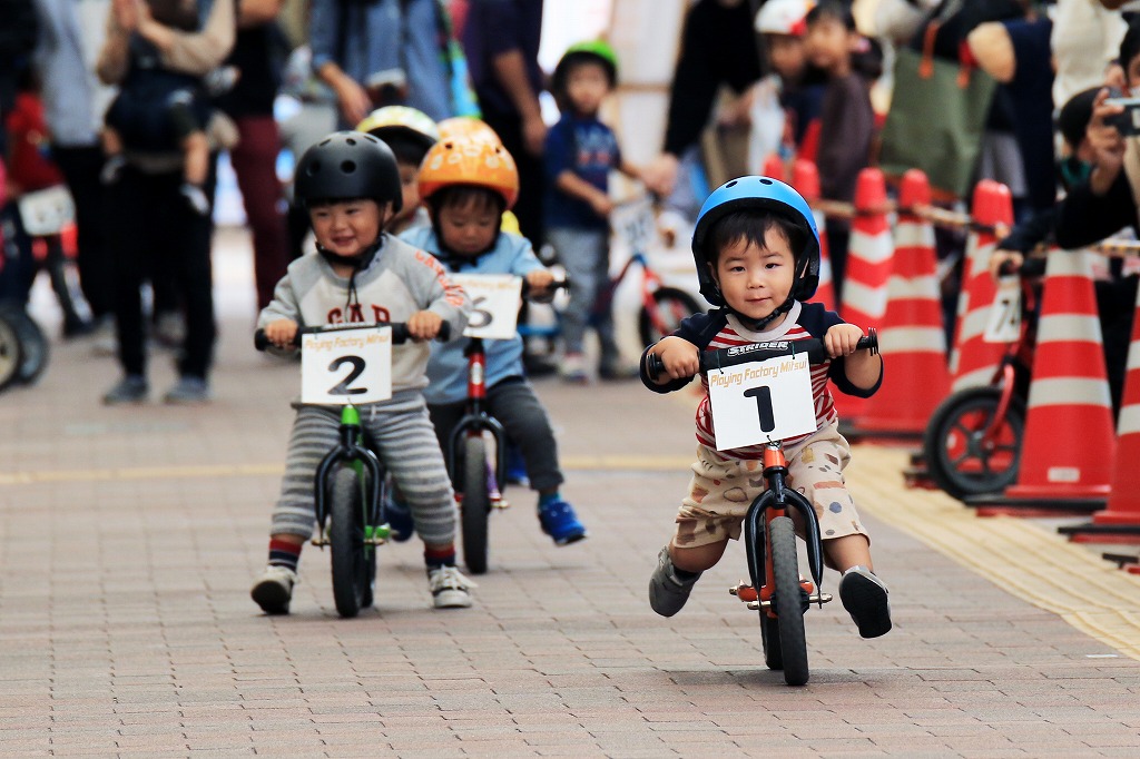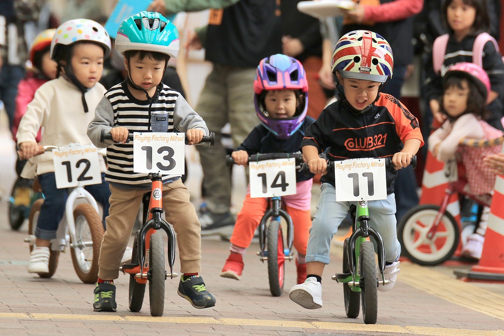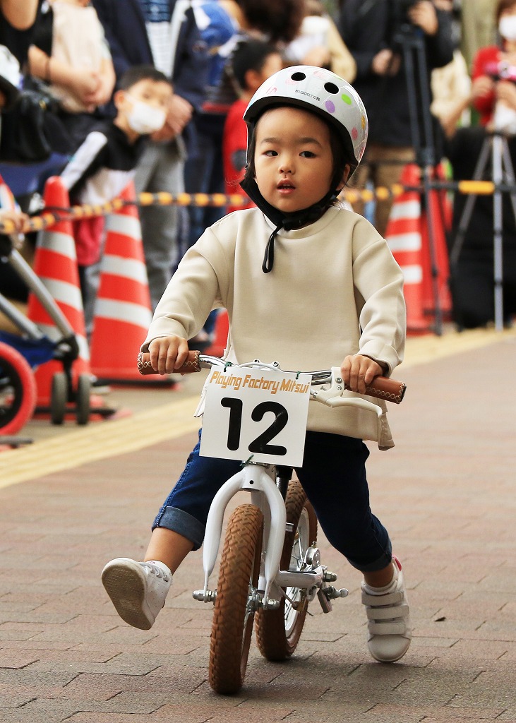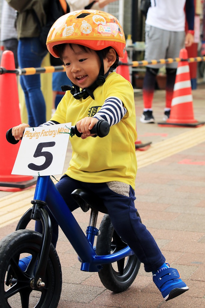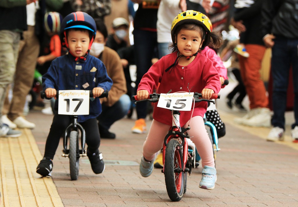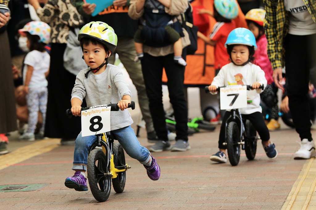 レース直前にエンジントラブル(泣き出し)で出走を断念した子どもや、母親の励ましを受けながら最後まで走りきる子どもの姿もあり、応援の人垣が笑顔にあふれました。途中で転倒しながらも走りきった子どもには、「ガンバレー」の声援と惜しみない拍手が贈られました。
