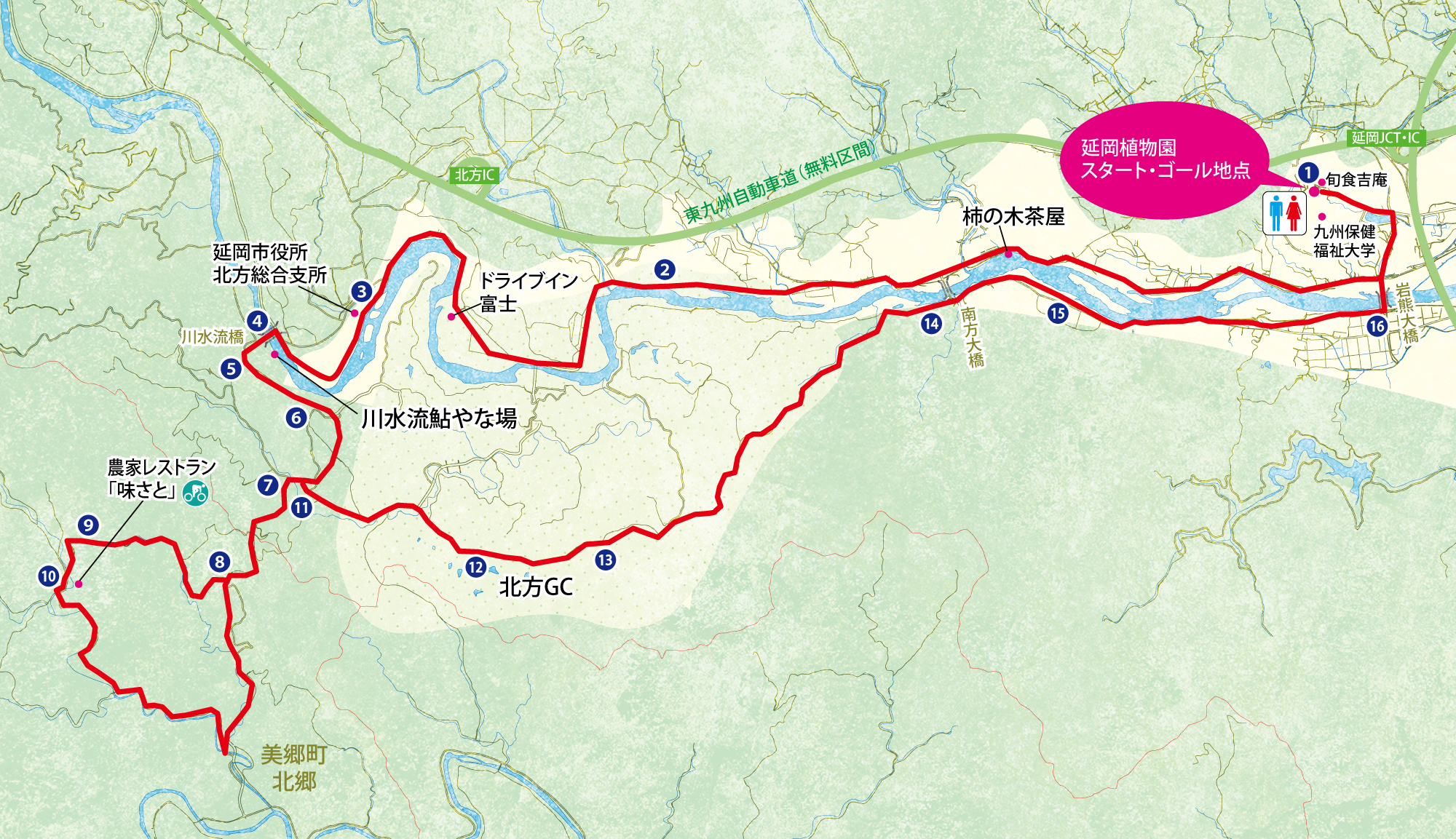 延岡植物園を発着点に、一級河川水質日本一の五ヶ瀬川沿いの景観を満喫するコースです。途中、隣接する美郷町北郷の小黒木集落を訪ねます。川沿いの県道は交通量も少なく、気持ちいい川風に気分がリフレッシュできます。小黒木集落では地取れ農産物をふんだんに使ったランチをいただきましょう。