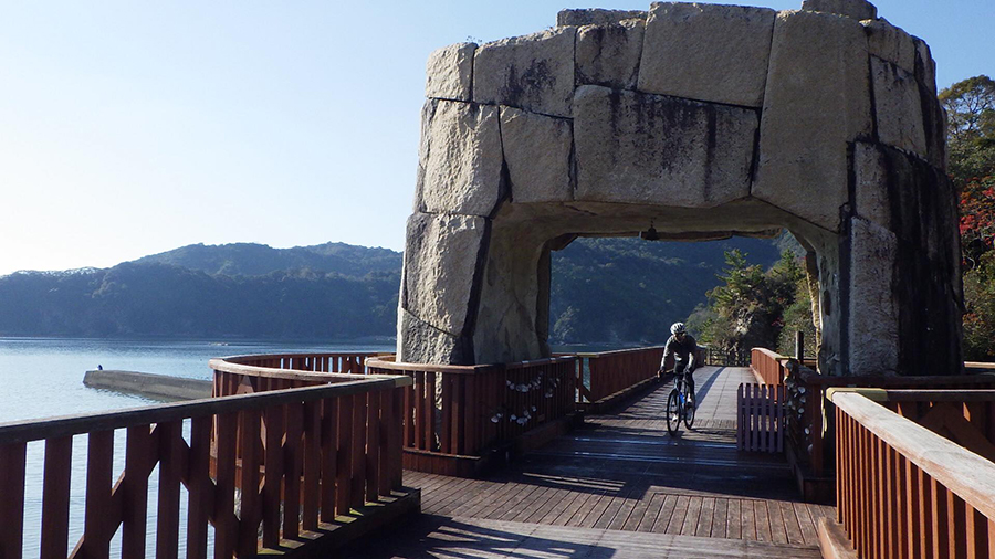 初心者にはアップダウンありでちょっとキツいかもだけど、水色の鳥居や太平洋を望む絶景は感動するし、リアス式海岸を走る気持ちよさもあるし、海の幸を目標に走ればキツさも楽しみに変わるはず、距離は50キロ弱と短いがベテランも満足できるコースです。